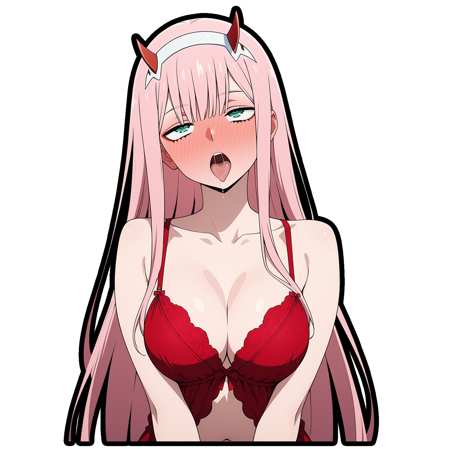 Show off your love for waifus with this stunning custom-cut anime sticker, featuring a bold design of Zero Two from Darling in the Franxx wearing revealing lingerie with an incredibly lewd ahegao expression!